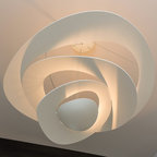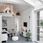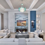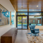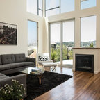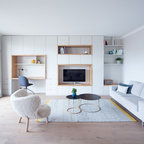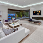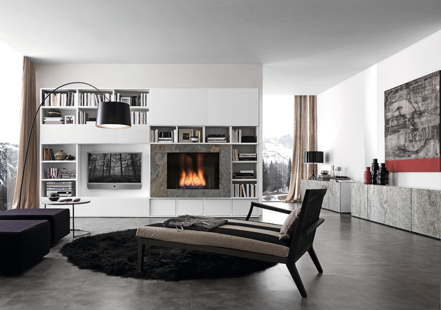 Diseño de sala de estar abierta, moderna, con paredes blancas, pared multimedia y chimenea lineal — Houzz