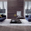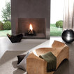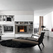 Media unit with white mat lacquer structure and bio alcohol burning fireplace in Silver Shine Stone. Sliding doors in white under painted glass.