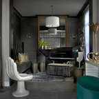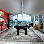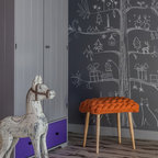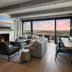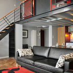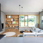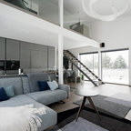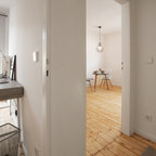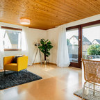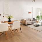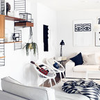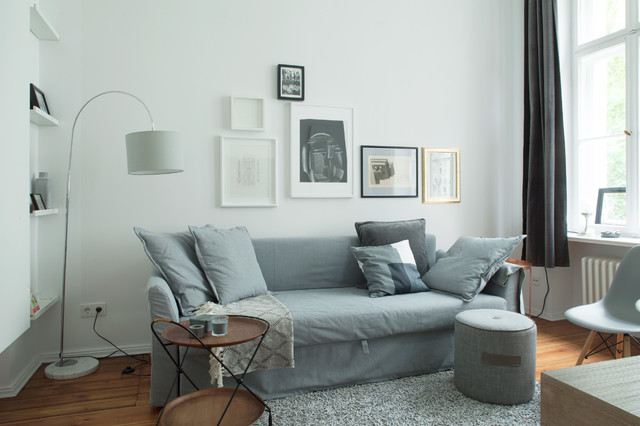 Modelo de sala de estar tipo loft, nórdica, pequeña, sin chimenea y televisor, con paredes blancas, suelo laminado y suelo marrón — Houzz
