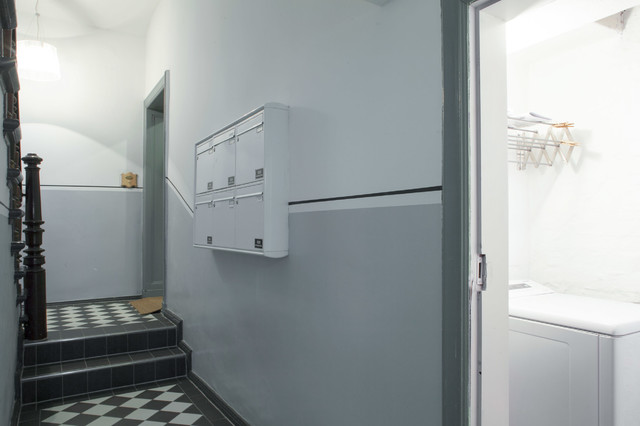 DESPUÉS: En un antiguo baño común situado en el pasillo de la planta baja, se ha habilitado un pequeño cuarto (1,5 metros cuadrados) con lavadora y secadora común para uso de los dos miniapartamentos: “Es una solución muy práctica, porque en espacios tan pequeños cada centímetro es un tesoro”, revela.El baño común del pasillo en la planta primera se ha transformado en un armario para productos de limpieza, con aspiradora, tabla de planchar y utensilios de cocina para hornear, una fondue y una batidora. Además, en el hueco de la escalera hay espacio para maletas. “Hemos abierto ventanas y puesto baldosas negras en el suelo en ambos cuartos auxiliares”, dice Bettina.