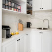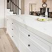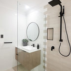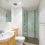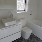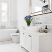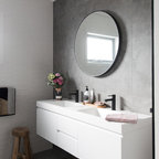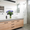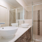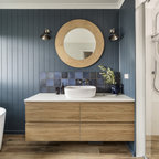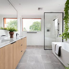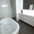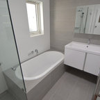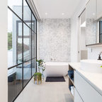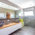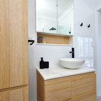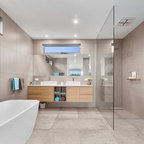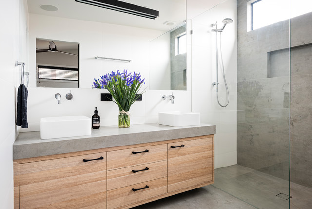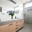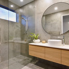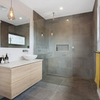 Ensuite featuring modern styling and up to the minute materials. Large format porcelain is hard wearing, does not show splash marks easily, easy to clean and suited to use on benchtops, floors and walls. While it is a more premium option, it works hard for your money.