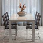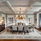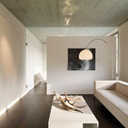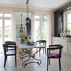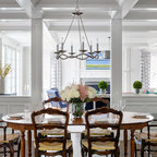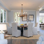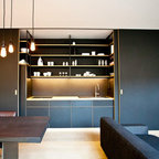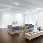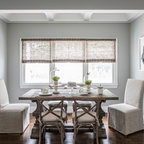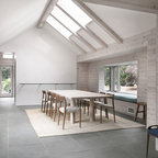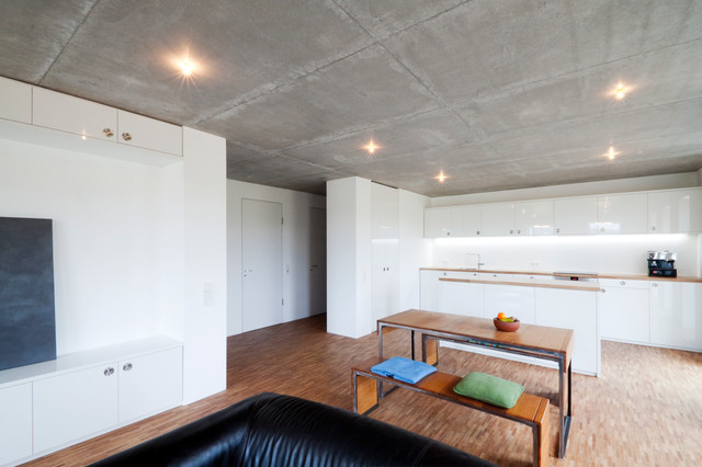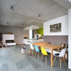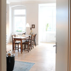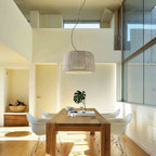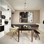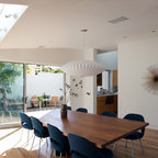 Diseño de comedor contemporáneo, de tamaño medio, abierto, con paredes blancas y suelo de madera en tonos medios — Houzz