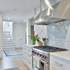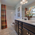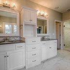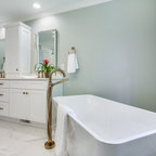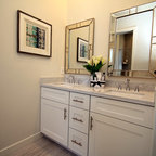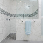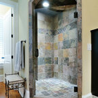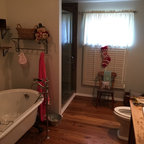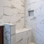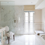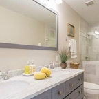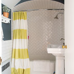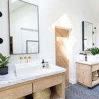 Imagen de cuarto de baño campestre con encimera de mármol, baldosas y/o azulejos de cemento y lavabo bajoencimera — Houzz