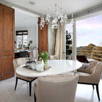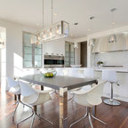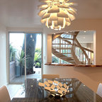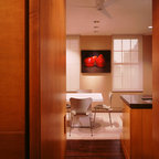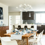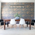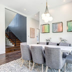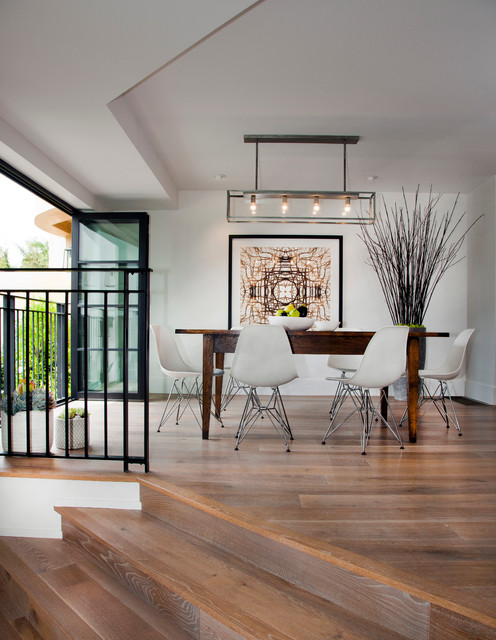 Modelo de comedor contemporáneo, grande, cerrado, sin chimenea, con paredes blancas, suelo de madera clara y suelo marrón — Houzz