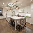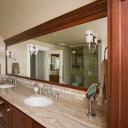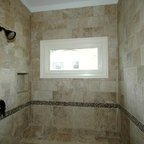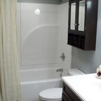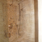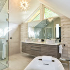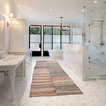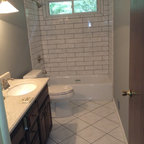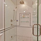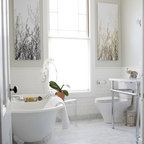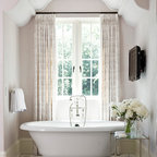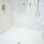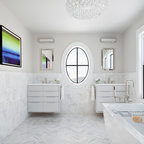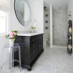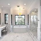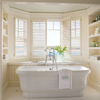 Ejemplo de cuarto de baño principal, tradicional, grande, con armarios estilo shaker, puertas de armario blancas, bañera exenta, baldosas y/o azulejos blancos, baldosas y/o azulejos de piedra, lavabo tipo consola, paredes blancas y suelo con mosaicos de baldosas — Houzz