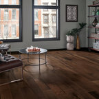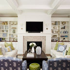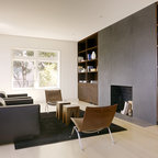 Imagen de salón abierto, retro, con paredes beige, suelo de madera oscura, chimenea tradicional y suelo marrón — Houzz