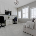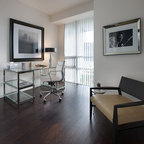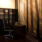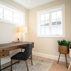 Foto de despacho actual con paredes blancas, suelo de madera clara y escritorio independiente — Houzz
