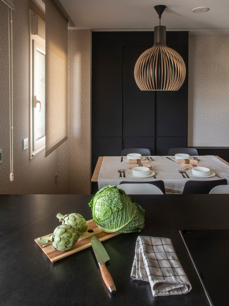 Negro y madera: una elegante cocina con península