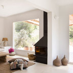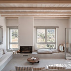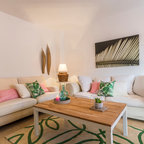 Modelo de salón para visitas mediterráneo con paredes beige, suelo de madera clara y suelo gris — Houzz