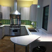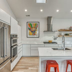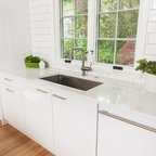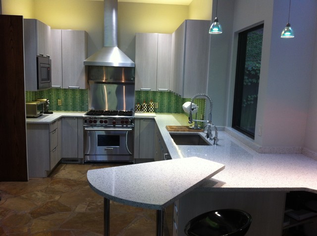 Imagen de cocina comedor en U, contemporánea, grande, con fregadero bajoencimera, armarios con paneles lisos, puertas de armario blancas, encimera de cuarzo compacto, salpicadero gris, salpicadero de azulejos de vidrio, electrodomésticos de acero inoxidable y suelo de pizarra — Houzz