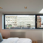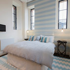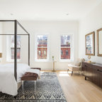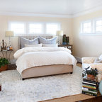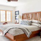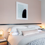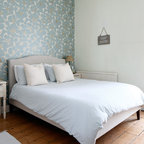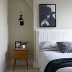 Modelo de dormitorio principal, nórdico, con suelo de madera pintada y paredes grises — Houzz