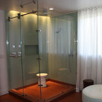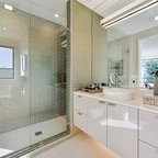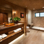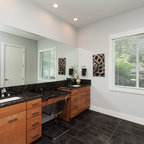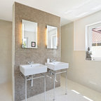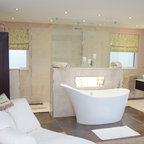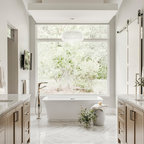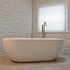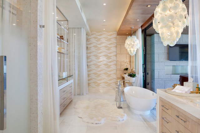 Imagen de cuarto de baño principal, contemporáneo, con armarios con paneles lisos, puertas de armario de madera clara, bañera exenta y baldosas y/o azulejos multicolor — Houzz