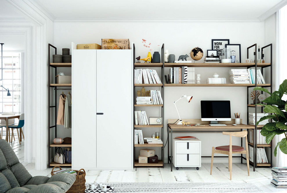 Sistema de piezas flexibles que combinan estructura de metal con tableros en madera. Máxima personalizacion.