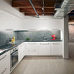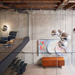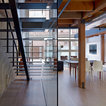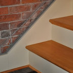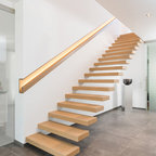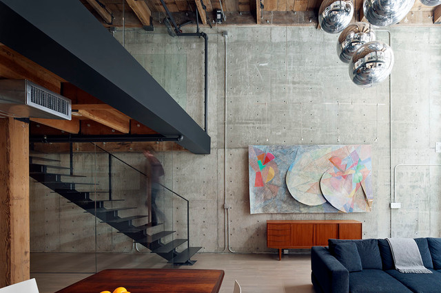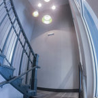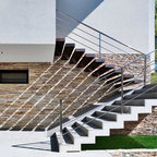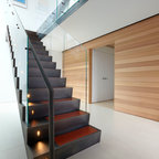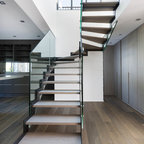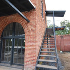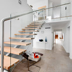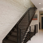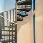 Ejemplo de escalera recta, urbana, pequeña, sin contrahuella, con escalones de metal y barandilla de metal — Houzz