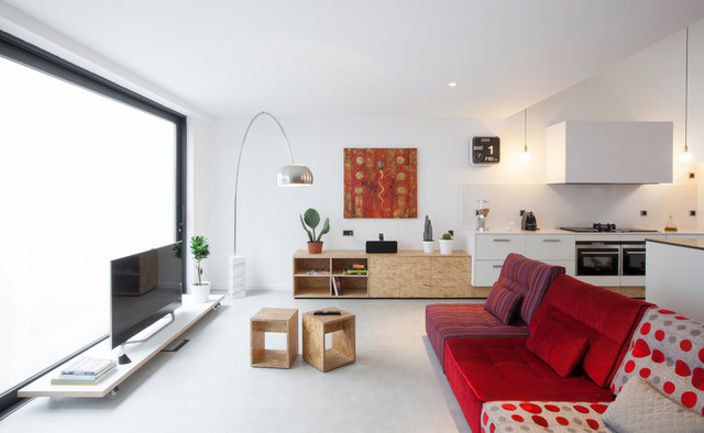 En ciertos casos convendrá adosar la cocina a una pared y desarrollarla longitudinalmente. Se puede integrar en un equipamiento continuo, por ejemplo, que empiece como cocina y que termine en el salón como estantería o aparador para la televisión. Truco: Los muebles concentrados en una pared ordenan y serenan la visualización de un espacio. Para que no sea una composición muy rígida, juega con distintas alturas y con algunos módulos abiertos que te permitan poner objetos decorativos.