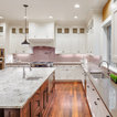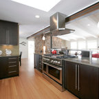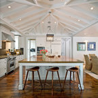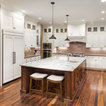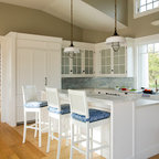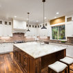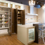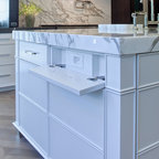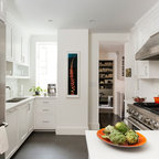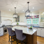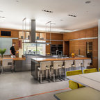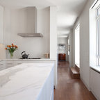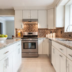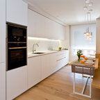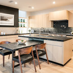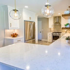 Imagen de cocina comedor en U, contemporánea, de tamaño medio, con fregadero bajoencimera, armarios estilo shaker, puertas de armario blancas, encimera de cuarzo compacto, salpicadero verde, salpicadero de azulejos tipo metro, electrodomésticos de acero inoxidable, suelo de madera en tonos medios, una isla y suelo marrón — Houzz