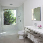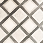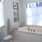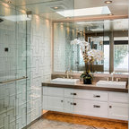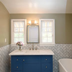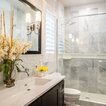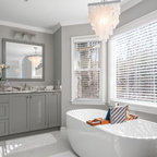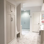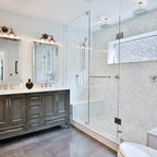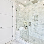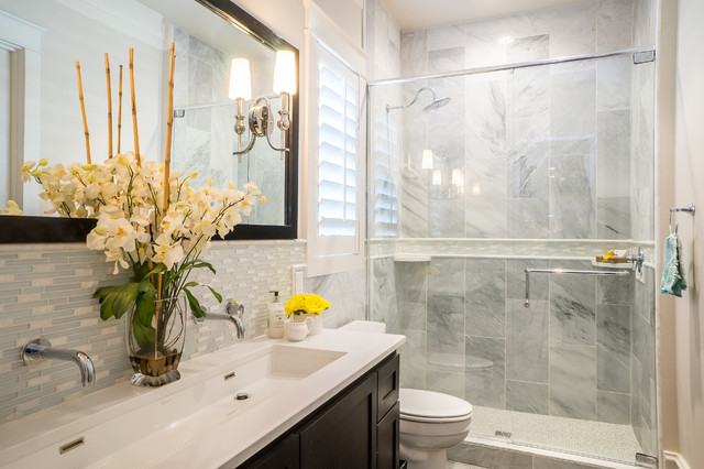 Diseño de cuarto de baño con ducha, clásico renovado, con armarios con paneles empotrados, puertas de armario negras, ducha empotrada, sanitario de dos piezas, baldosas y/o azulejos grises, baldosas y/o azulejos blancos, baldosas y/o azulejos de mármol, paredes grises, lavabo de seno grande y ducha con puerta con bisagras — Houzz