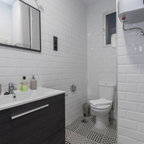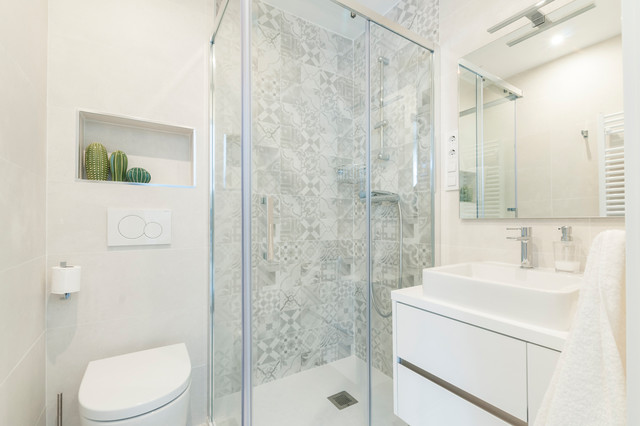2. Pequeño pero funcional ¡y bonito!Clara Dos Santos, directora del estudio de interiorismo Espacio Concept, informa que este piso en el barrio de Chamberí de Madrid constaba de dos dormitorios y un solo baño. “Los propietarios querían dos, por lo que este baño fue ganado tras la reforma. Es pequeño pero suficientemente cómodo para un uso continuo”, cuenta la profesional. Para aligerar visualmente la estancia, se optó por piezas suspendidas como el mueble de lavabo y el inodoro. Respecto a los revestimientos cerámicos, “utilizamos colores neutros para no recargar demasiado y buscamos el juego entre el suelo y la esquina de la ducha con una baldosa tipo hidráulica también en colores neutros”, continúa Dos Santos. Vemos una hornacina sobre el inodoro, que permite incorporar algún elemento decorativo o aprovecharlo para almacenaje.Encuentra empresas de instalación y reformas de cocinas y baños cerca de donde vives
