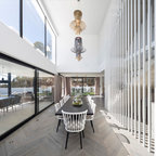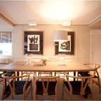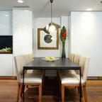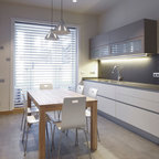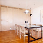 Ejemplo de comedor contemporáneo, pequeño, cerrado, sin chimenea, con paredes grises y suelo de madera en tonos medios — Houzz
