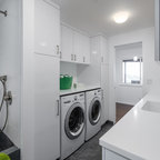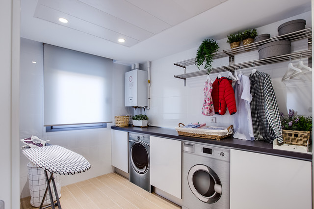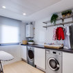 Lavandero de excelentes dimensiones, con excelente disposicion de Lavadora, Secadora y mesa para planchar. Iluminacion apropiada, sobrio colores de piso y paredes en combinacion con los artefactos.