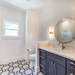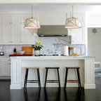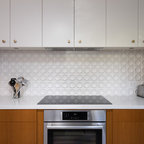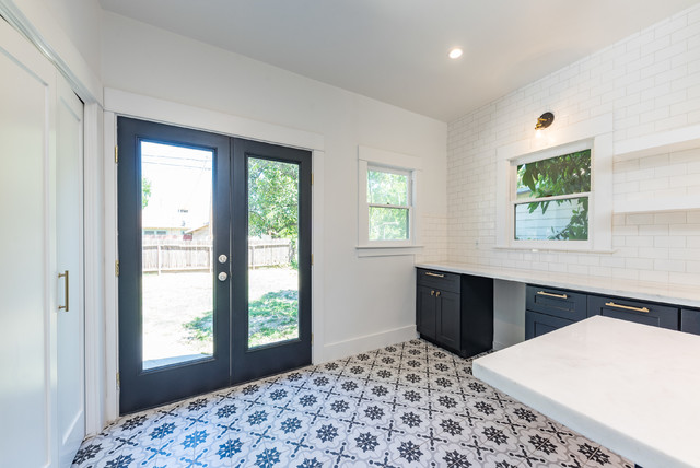 Foto de cocina de galera, contemporánea, de tamaño medio, cerrada, con fregadero bajoencimera, armarios estilo shaker, puertas de armario blancas, encimera de acrílico, salpicadero blanco, salpicadero de azulejos tipo metro, electrodomésticos de acero inoxidable, suelo de baldosas de cerámica, una isla y suelo multicolor — Houzz