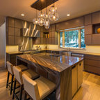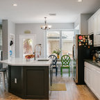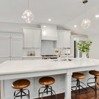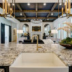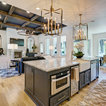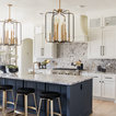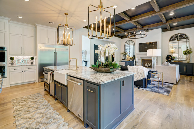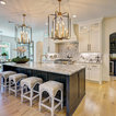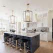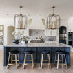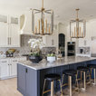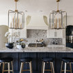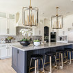 Light fixtures! Flow into living space. Contrasting island cabinets vs wall cabinets
