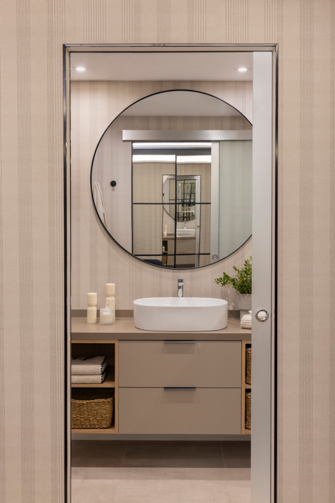 Para las paredes, se ha escogido un papel pintado combinado con porcelánico. Los acabados y los tiradores se han escogido también a tono con el resto de la vivienda.