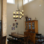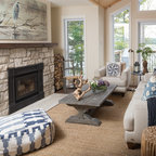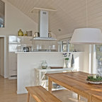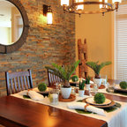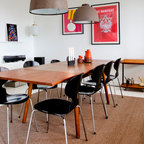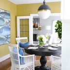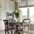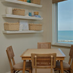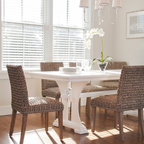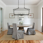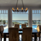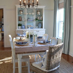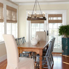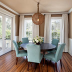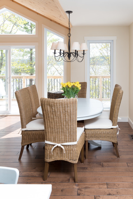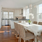 Diseño de comedor costero con paredes beige y suelo de madera oscura — Houzz