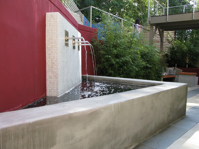 color of wall, water feature breaks up monotonousness of wall