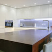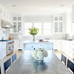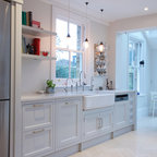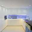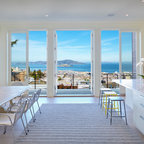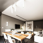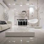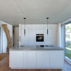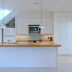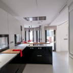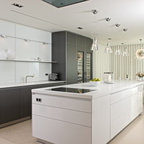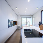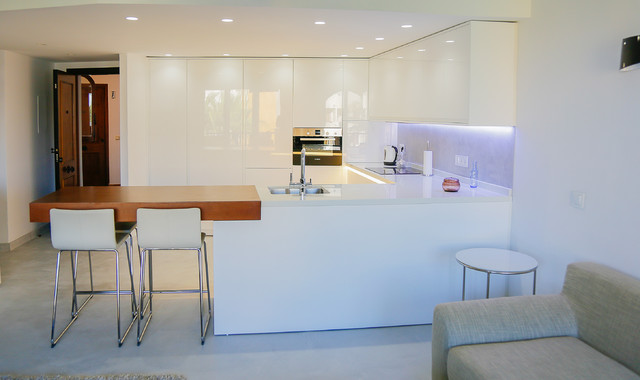 Imagen de cocina en L, actual, de tamaño medio, abierta, con fregadero de un seno, armarios con paneles lisos, puertas de armario blancas, electrodomésticos de acero inoxidable y península — Houzz