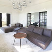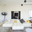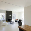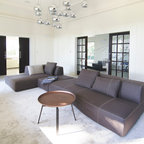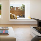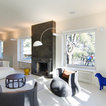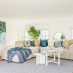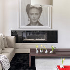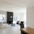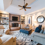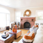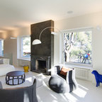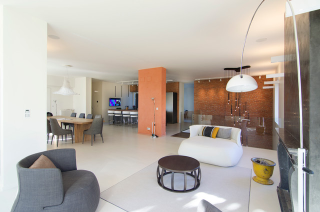 Modelo de sala de estar abierta, actual, grande, sin televisor, con paredes multicolor y chimenea tradicional — Houzz