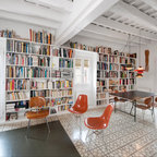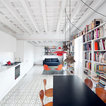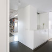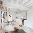 Este espacio tan alargado, ha visto reforzada ópticamente su longitud mediante dos sencillos recursos. Por un lado, se optó por adosar mobiliario continuo, hecho a medida, en cada uno de los lados más largos. De esta manera, la estancia ofrece una sensación de infinito proporcionada por dos elementos muy prolongados que acompañan durante todo el recorrido: en este caso, una gran estantería repleta de libros por el lado de la fachada a la calle, y muebles de cocina y almacenaje en la pared opuesta.Blanco total en la cocina. Cómo ganar en calidez sin hacer concesiones
