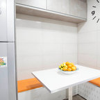 single wall appliances, table and sgelves for study