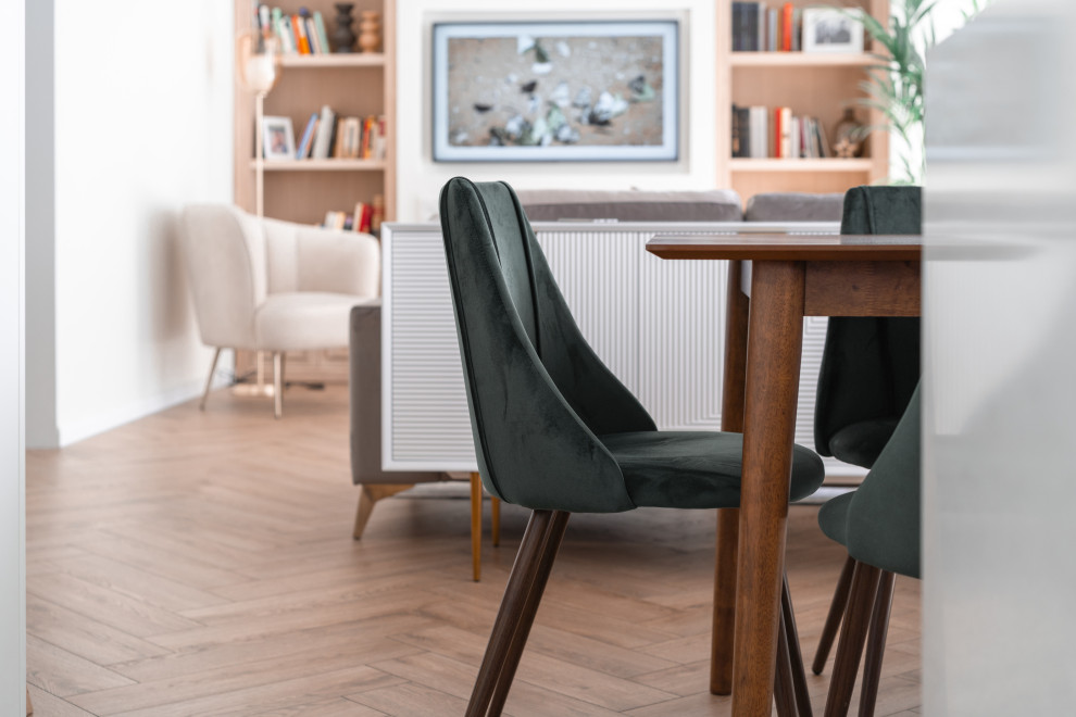 Mezclar maderas siempre es un acierto si se hace con equilibrio. Mesa de comedor en madera de nogal en contraste con la tarima en espiga y el mueble librería de roble.