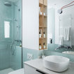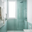 Para la reforma de cuarto de baño junto al dormitorio principal se han utilizado unas teselas de hexágono en tono verde aguamarina. Se combinan con una baldosa de gran formato cuadrada en gris cemento.