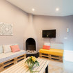 iluminación (natural y artificial LED), disposicion de mobiliario, texturas de la pared acentuadas , luces empotradas y colgantes, colores sosegados y suaves.