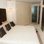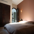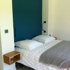 Imagen de dormitorio contemporáneo con paredes negras y moqueta — Houzz