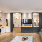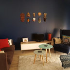 Modelo de salón abierto, contemporáneo, de tamaño medio, sin televisor, con paredes negras, suelo de cemento y chimenea tradicional — Houzz