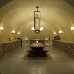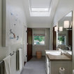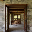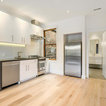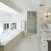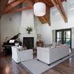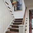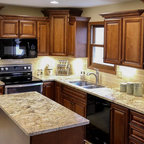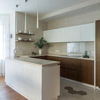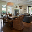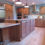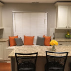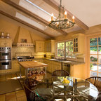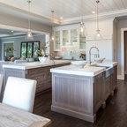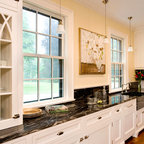 Foto de cocina en U, tradicional, abierta, con electrodomésticos de acero inoxidable, encimera de madera, puertas de armario blancas, armarios estilo shaker, salpicadero metalizado, salpicadero de metal, fregadero bajoencimera, una isla y suelo de madera oscura — Houzz