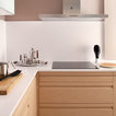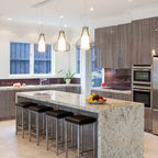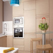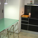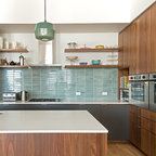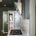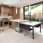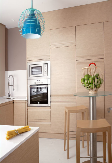 Foto de cocina comedor en U, actual, de tamaño medio, sin isla, con armarios con paneles lisos y puertas de armario de madera clara — Houzz