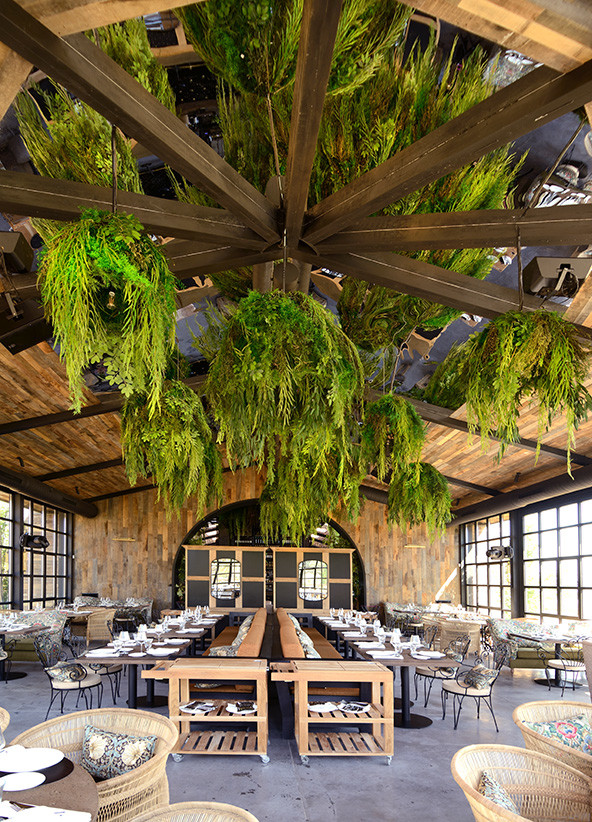 En el diseño realizado, se ha primado la base orgánica y natural, con matices de singularidad y modernidad, que permite estructurar todo el entorno, recreando un paisaje de coníferas y frondosas (cedros y abedules) en cotas entre 650 y 1500 metros de altitud capaces de abrigar a la cabaña, unido a diversas especies de cromatismos rojizos, naranjas y amarillos (rus, nandina, pyrus, serbal, parra virgen y vides), y el rincón de huerta que une conceptual y mediante su consumo el jardín con el restaurante. El diseño natural, queda apoyado por elementos como la madera, dispuesta en vallas, panelados y fachadas, y el terrizo tipo jabre para los pavimentos y áreas de tránsito.