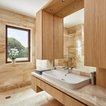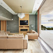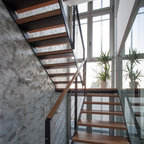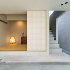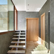 Medium wood frames windows and doors Medium gray walls Light gray concrete floors