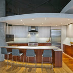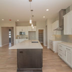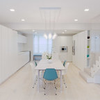 Foto de cocina comedor en U, contemporánea, grande, con fregadero bajoencimera, armarios estilo shaker, puertas de armario verdes, salpicadero blanco, salpicadero con mosaicos de azulejos, electrodomésticos de acero inoxidable, suelo de madera en tonos medios, una isla, suelo marrón y encimeras blancas — Houzz