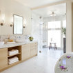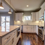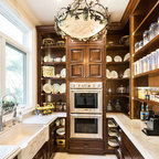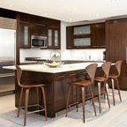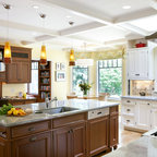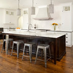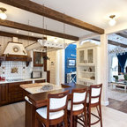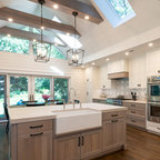 Waterfall island brown cabinets