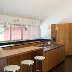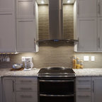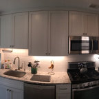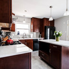 Ejemplo de cocina de galera, actual, con fregadero bajoencimera, armarios con paneles lisos, puertas de armario de madera en tonos medios, encimera de mármol, salpicadero blanco, salpicadero de losas de piedra, electrodomésticos de acero inoxidable y encimeras blancas — Houzz