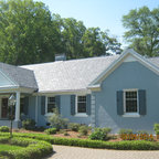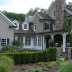 This cottage style architecture was created by adding a 2nd floor and garage to this small rambler.