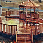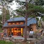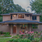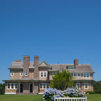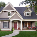 Imagen de fachada clásica con revestimiento de madera y tejado a dos aguas — Houzz