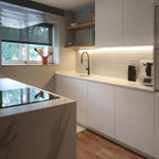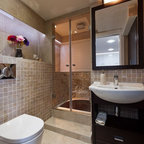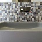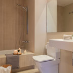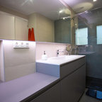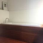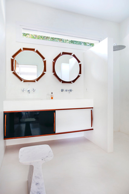le meuble sous vasque est noir et blanc, avec des portes cernées de marron, directement inspiré des créations classiques de Charlotte Perriand. Les miroirs ronds italiens des années 70 ajoutent une pointe de style. Le tabouret en marbre est le modèle Pura, de Adolfo Abejón.