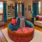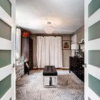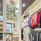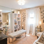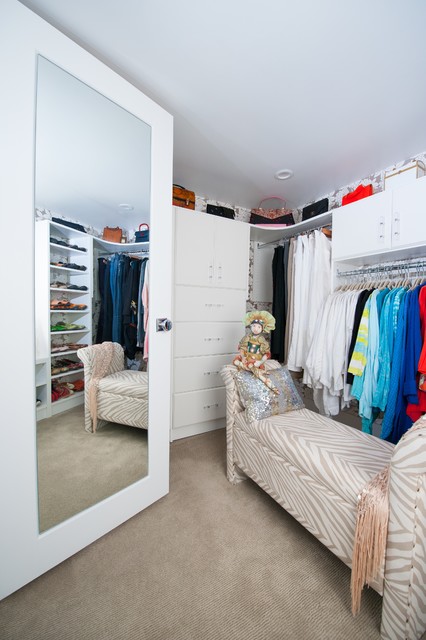 Ejemplo de armario vestidor de mujer, ecléctico, de tamaño medio, con armarios con paneles lisos, puertas de armario blancas y moqueta — Houzz