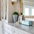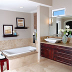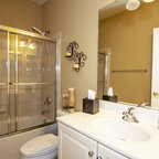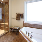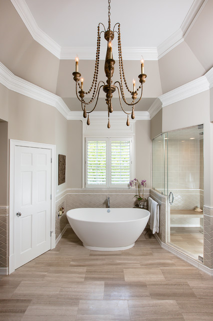Ejemplo de cuarto de baño clásico con bañera exenta, ducha esquinera, baldosas y/o azulejos beige y paredes beige — Houzz
